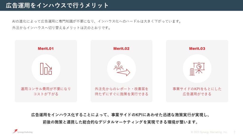 繰り返しになりますが、インハウス化によって得られるメリットは、コスト効率の向上と戦略的な柔軟性の確保です。外部代理店に依存することなく、自社で直接広告運用を行うことで、手数料や中間コストを削減できます。